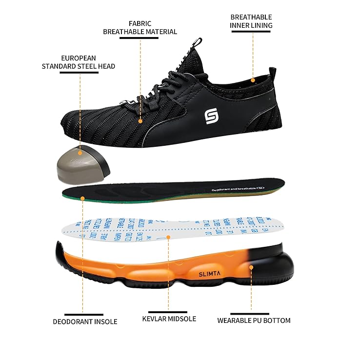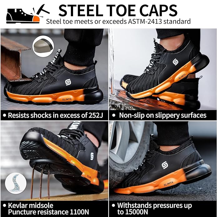 SLIMTA® Safety Shoes for Men Women Steel Toe Boots Non-Slip Lightweight Breathable Sneakers Puncture Proof Protective Industrial Black Work Shoes